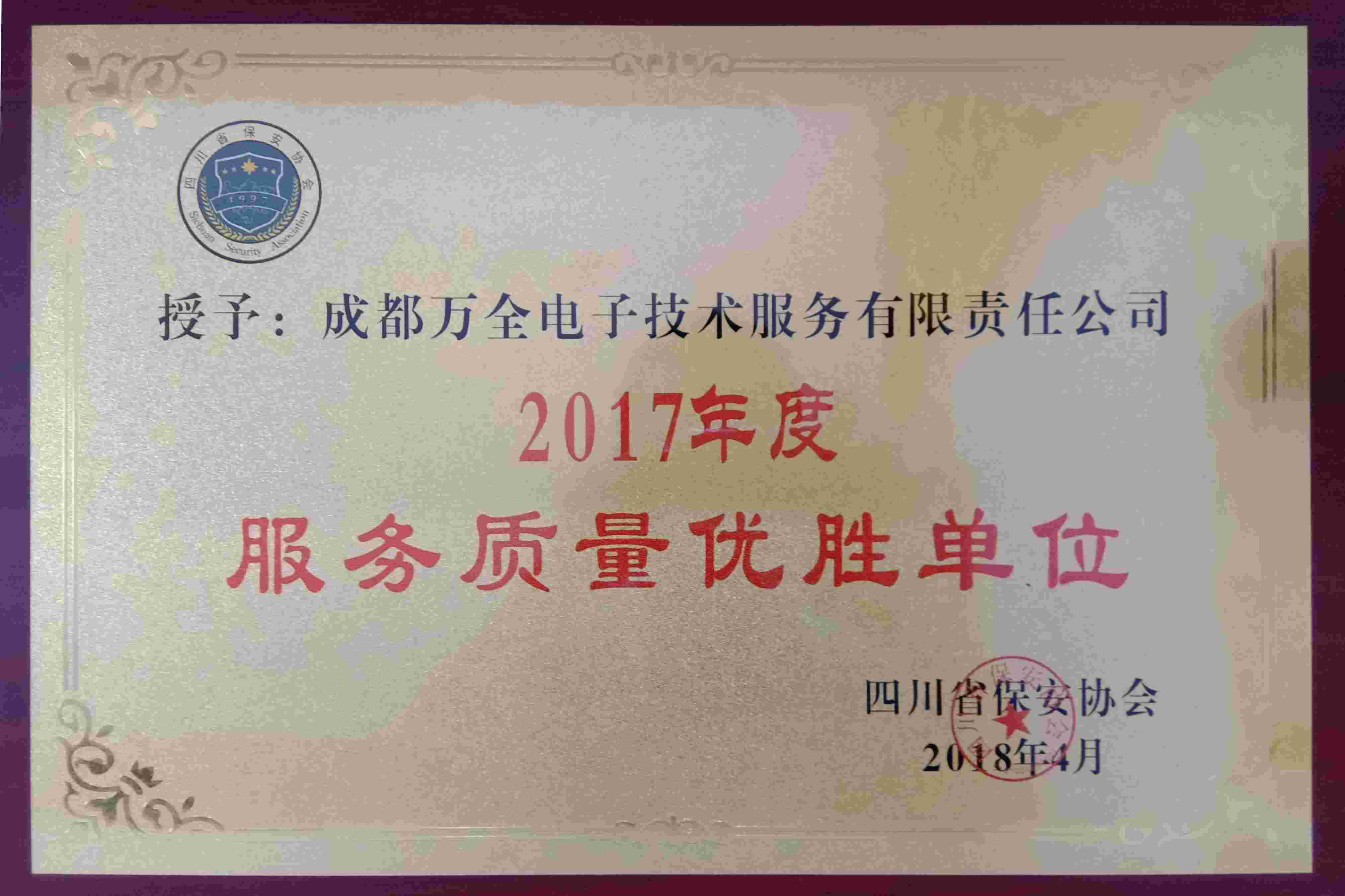 2017年4月四川省安保協(xié)會(huì)授予成都萬(wàn)全電子“2017年度服務(wù)質(zhì)量?jī)?yōu)勝單位”稱(chēng)號(hào)