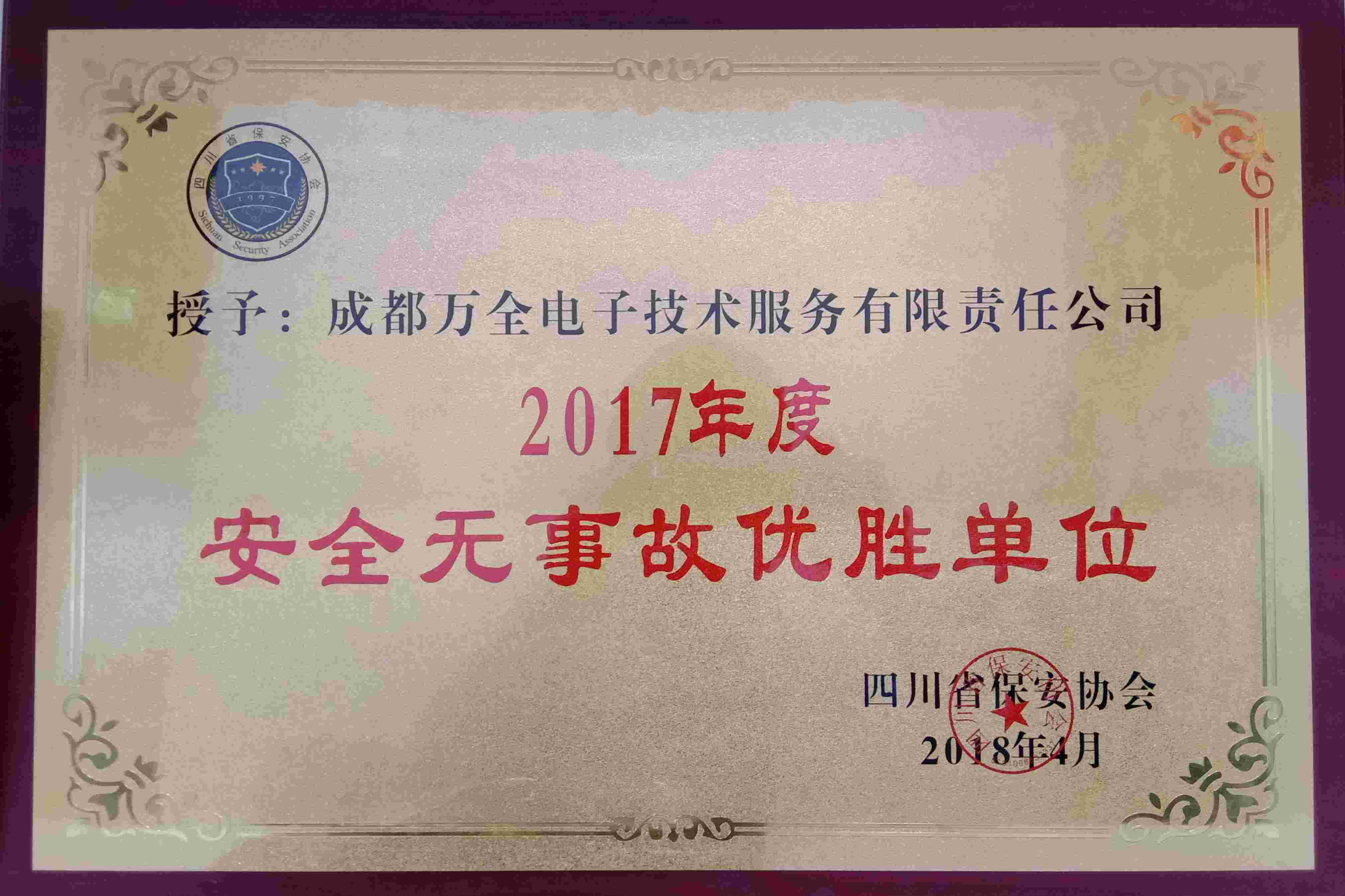2017年4月四川省安保協(xié)會(huì)授予安防集成商成都萬(wàn)全電子“2017年度安全無(wú)事故優(yōu)勝單位”稱(chēng)號(hào)