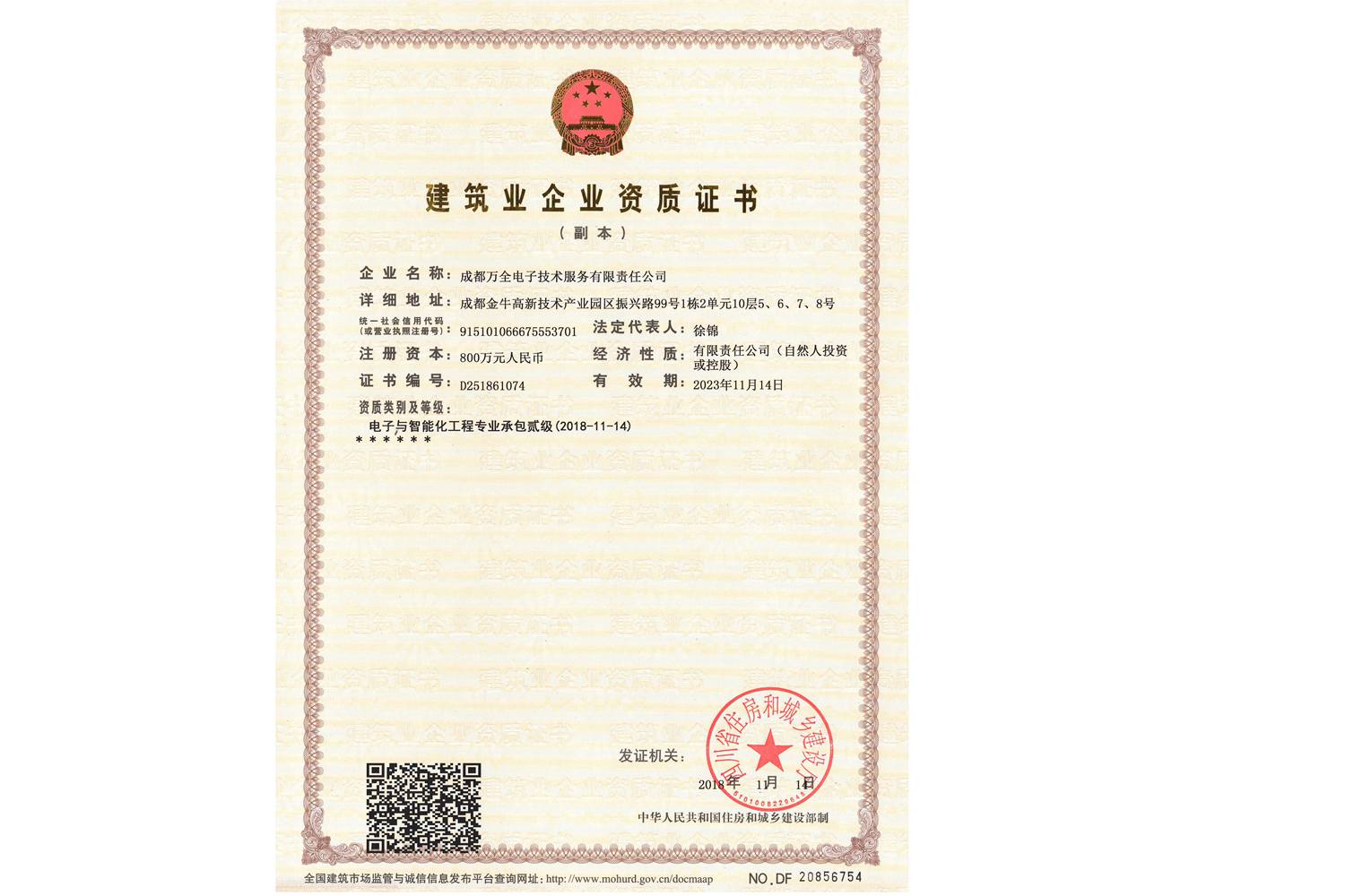 安防工程公司成都萬(wàn)全電子取得建筑企業(yè)資質(zhì)